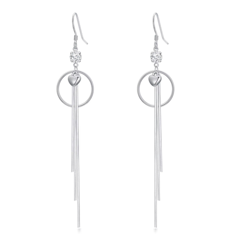 Fine Jewelry 925 Sterling Silver Zircon Heart and Circle Long Tassels Hook Earrings for Women