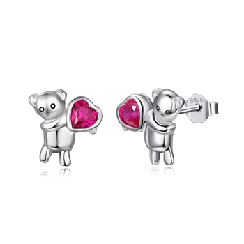 New Arrival 925 Sterling Silver Cute Bear Holding a Birthstone Crystal Heart Stud Earrings for Women